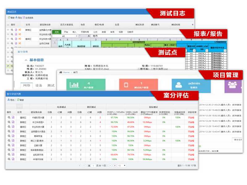 平台侧采用工业级标准的J2EE平台,具有很强的安全性和可扩展性。平台端功能同样强大,提供了项目管理、测试点管理、测试日志管理与分析、室分评估、一键式报表/报告生成等功能。
