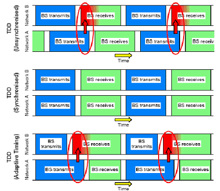 对于LTE TD D系统,因为是时分双工,这对系统的时钟同步要求很高。如同一个网络中的某基站A与周围其他基站的时钟不同步,这就造成基站A的DL信号被周围的基站接收到,故而干扰到了周围基站的上行接收。如下图示意的,时钟不同步的A基站发射信号干扰到了B基站的上行接收。通常基站天线比较高,典型的如城区30m,郊区40m,两个基站天线间可能都是视距传播,一个基站的发射信号很容易被其他基站接收到。因而干扰会很严重。