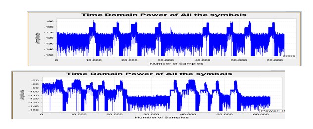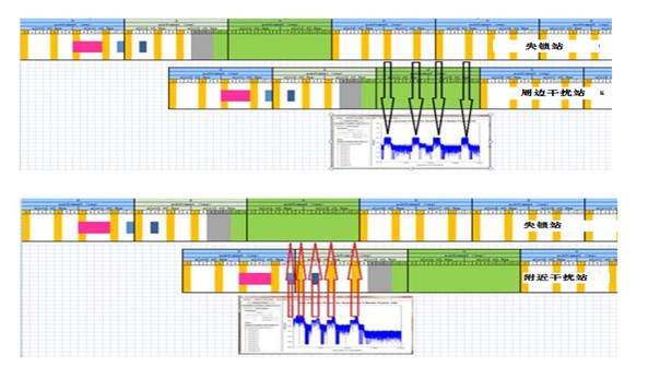 进一步观察疑似失锁干扰小区的反向频谱图,能看到都有明显TDD下行导频干扰特征,疑似失锁或配置错误造成的TDD干扰。