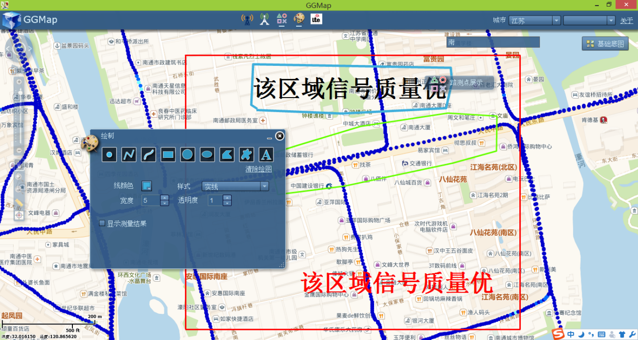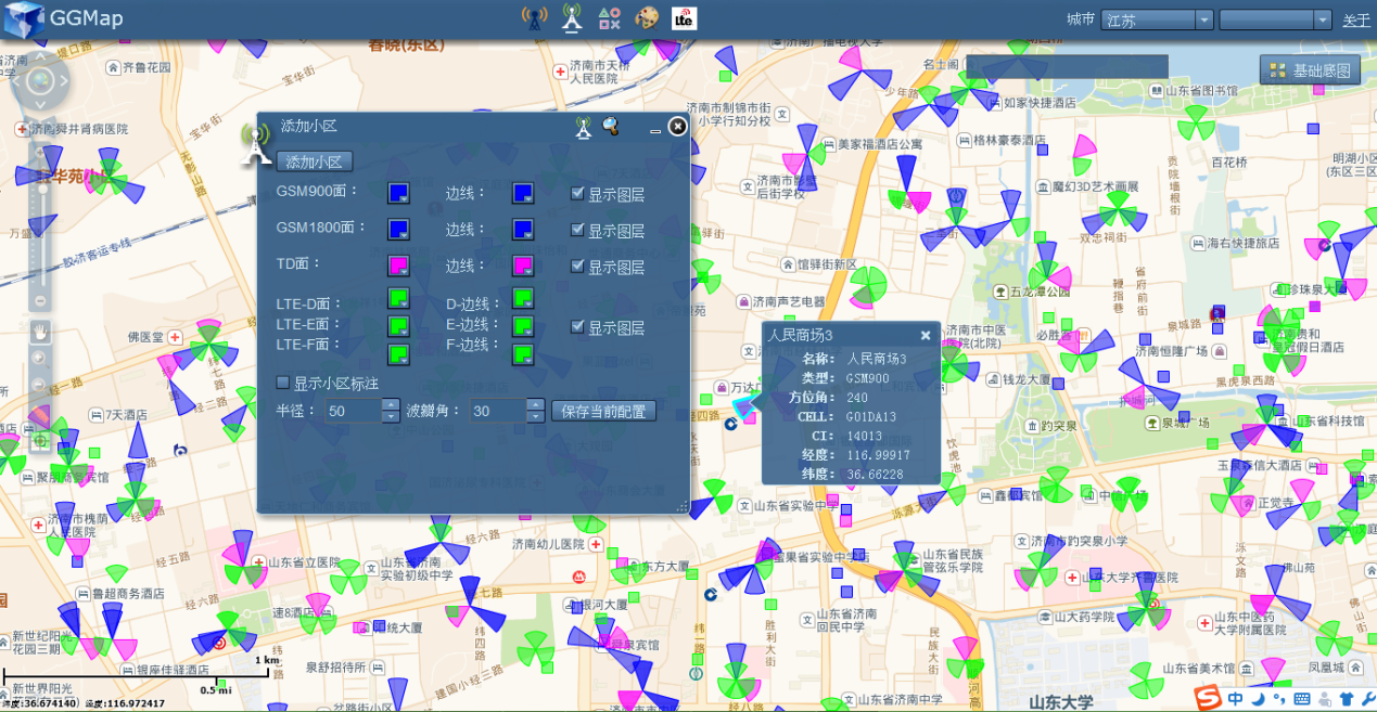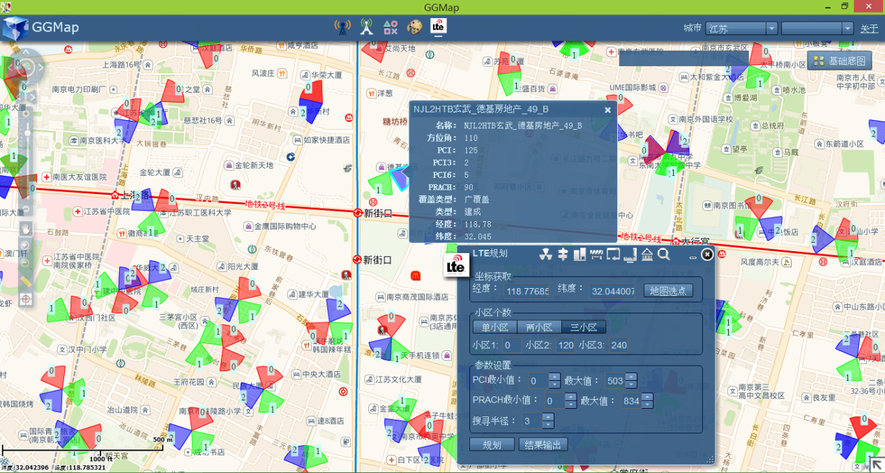 GGMap将无线通讯小区无偏差的投影到在线地图(高德街道、高德影像、谷歌街道、谷歌影像),并能让用户自定义展示样式。同时还支持 LTE-PCI规划、路测数据地图展示、地图标会功能。